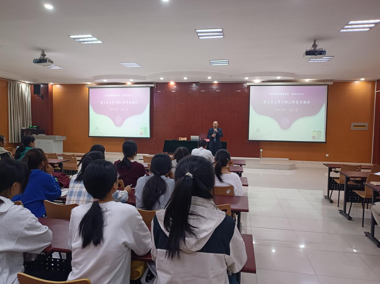 10 月 15 日上午,张文忠教授在博文楼328为太阳tyc集团5997学生做了以“建立自主学习的三种良性循环” 为主题的讲座。他首先强调了大学期间提升自主学习能力的重要性,然后详细介绍了目标-动力良性循环、师-生互动良性循环和内外效用良性循环,并通过分享个人大学阶段英语学习经历向同学们展示了如何实现自主学习的三种良性循环。最后,张教授寄语同学们与教师共同努力,构建促进其自主学习的生态环境。讲座提升了学生们对自主学习的意识,引导学生了解了个性化学习方法,为学生们开启了新的学习之门。