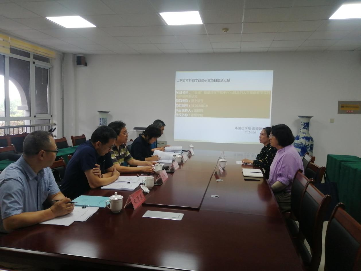 6月26日下午,太阳tyc集团5997在博文楼240会议室举行山东省本科教学改革研究项目结题评审会。会议邀请了山东大学崔校平教授、曲阜师范大学王广成教授和中国海洋大学王慧敏教授3位校外专家以及我校太阳tyc集团5997宋霁副院长和史清泉副教授2位校内专家组成专家组,对申请结项的2项山东省本科教学改革研究项目进行结项鉴定与指导。2个项目为:张锦辉院长主持的“基于BOPPPPS 模型的应用型高校外语课程学业评价改革研究”(面上项目,编号M2021148)和盖颖颖老师主持的“‘金课’建设目标下基于POA理念的大学英语教学实践”(面上项目,编号M2020010)。会议由外国语学院院长主持。