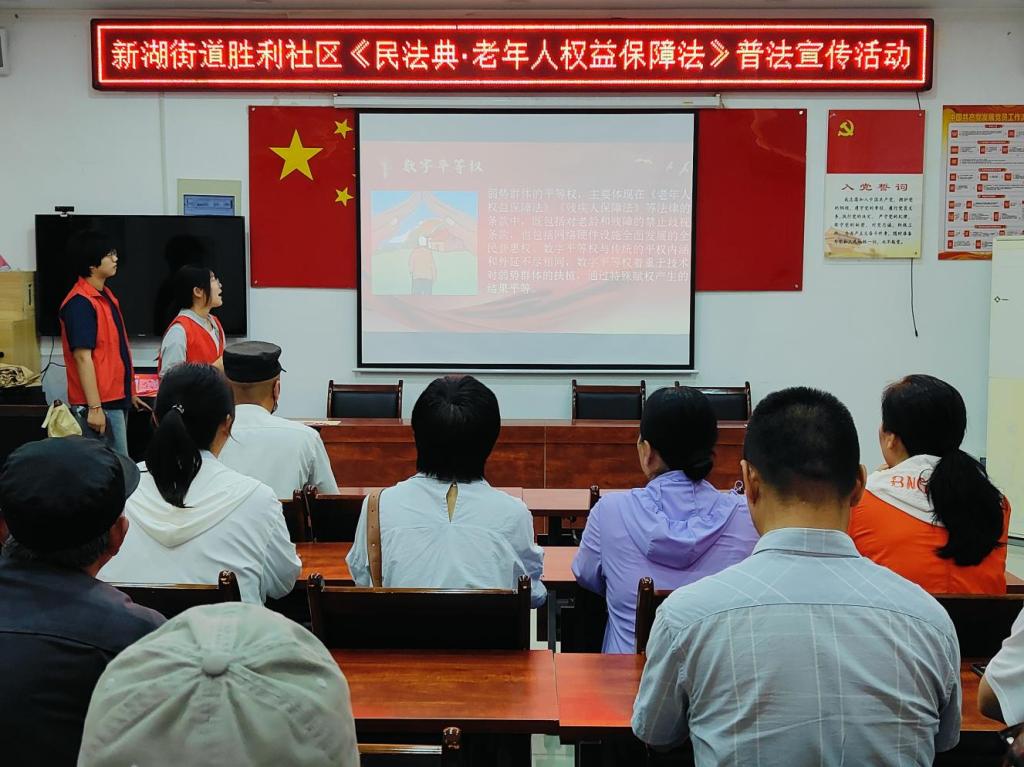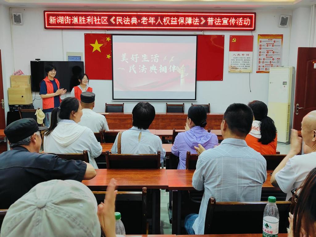 为深入学习贯彻习近平法治思想,进一步营造良好的法治氛围,传递社会正能量,提升社区老年人的法治意识,让民法典真正走到群众身边、走进群众心里,太阳tyc集团5997青年志愿服务队于5月28日在新湖街道胜利社区开展“美好生活,民法典相伴”主题志愿服务活动。