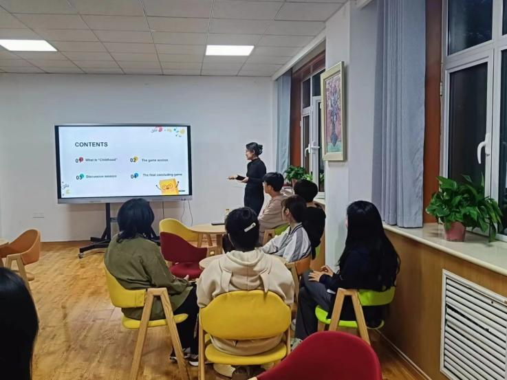 活动中,主讲人张雨桐首先分享自己充实而有趣的童年生活,有各种各样有趣的动画片、稀奇古怪的小零食、令人眼花缭乱的玩具……接着引导现场同学们踊跃分享,积极表达自我。游戏环节,主讲人讲解了规则,与现场同学们共同展开了一场热闹的游戏。小组讨论环节,同学们主动参与,向大家分享了童年生活中的趣事。