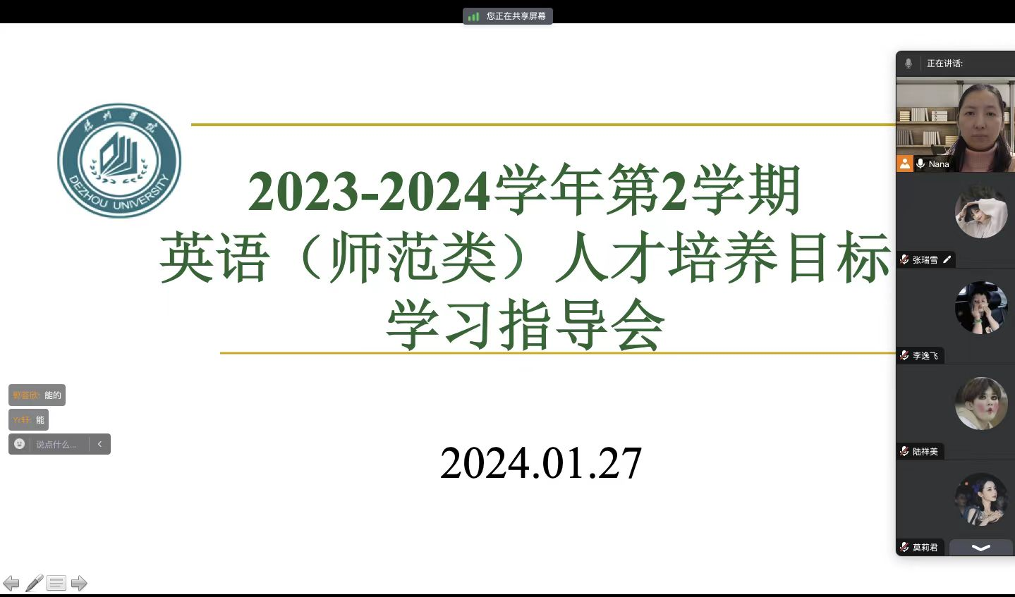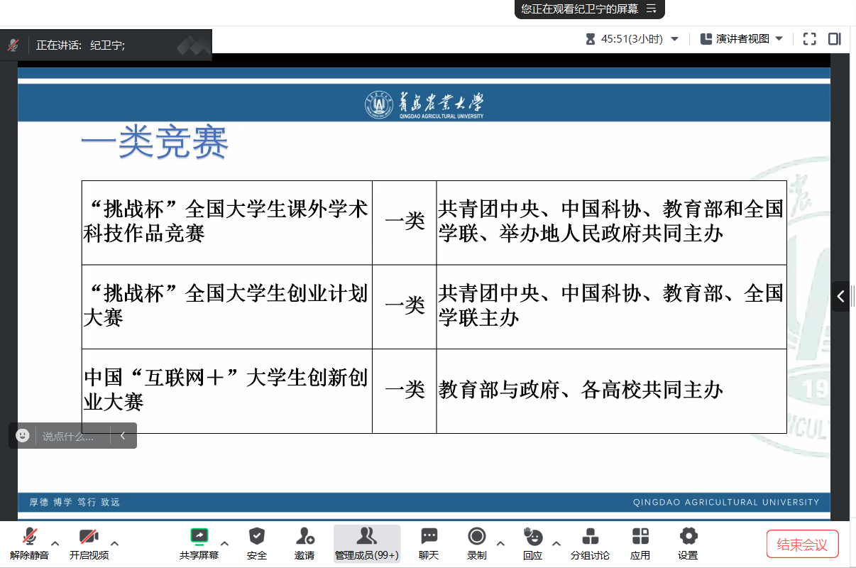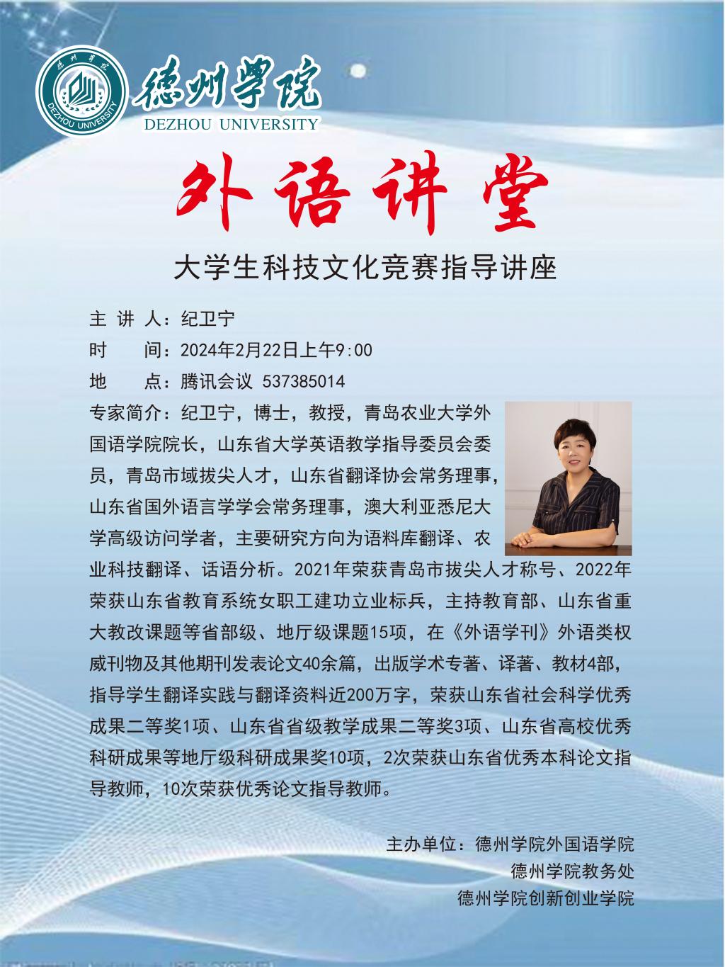 为促进学院专业建设、学科发展、人才培养与创新创业竞赛相融合,进一步提高大学生创新创业思维与能力,2月22日,太阳tyc集团5997邀请青岛农业大学太阳tyc集团5997院长纪卫宁教授做题为“提升双创能力,做新时代外语人才”的专题指导讲座。本次讲座系太阳tyc集团5997“云上德院 寒假赋能”的系列活动之一,2022级、2023级100余名学生参加了本次讲座。