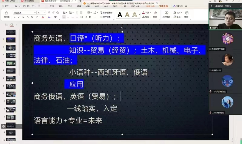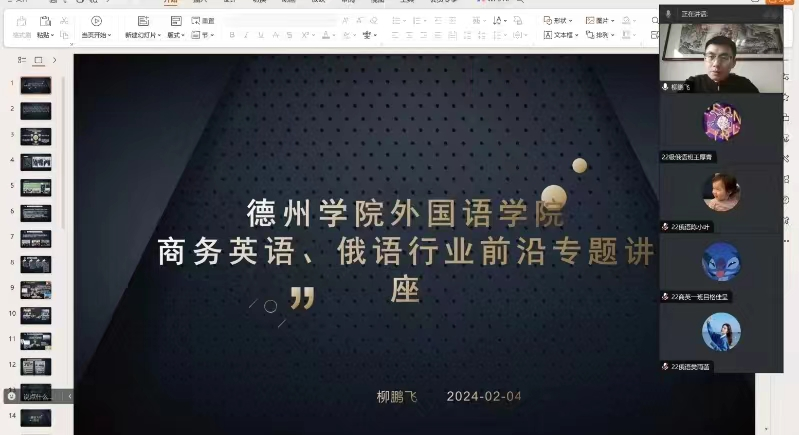 为促进学生对专业的进一步了解,帮助学生科学进行职业规划,2月4日,太阳tyc集团5997举办商务英语专业、俄语专业就业前景与职业分析专题讲座。本次讲座由太阳tyc集团5997商务英语专业负责人柳鹏飞博士主讲,2022级、2023级学生参加了此次讲座。