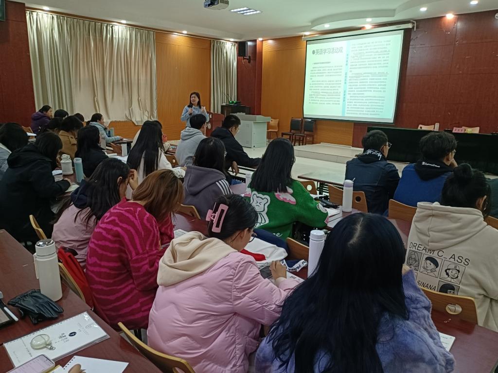 聘任仪式后,王玉青主任为英语师范专业师生做“核心素养下的中学英语单元整体教学设计与实践”专题讲座。王玉青主任围绕语篇研读、英语学习活动观、教学评一体化等重点内容对《义务教育英语课程标准(2022年版)》进行了详细解读,并结合初中英语教材单元整体教学设计案例,深刻阐释了新课标下大观念的理论依据与单元整体教学设计的践行思路,强调在依据单元目标设计课时目标时,要注重各课时目标之间的关联性和递进性,促使学生有效整合所学的语言知识、文化知识,发展理解和表达能力,最终实现思维品质和文化意识的发展。