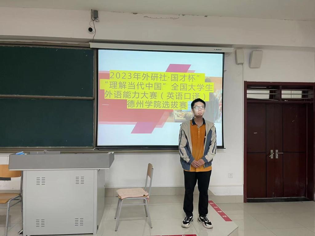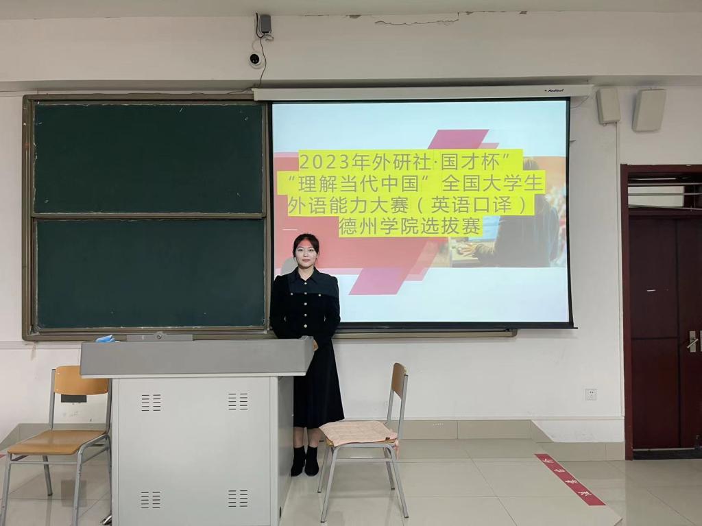 2023年9月26号下午,2023年“外研社·国才杯”“理解当代中国”全国大学生外语能力大赛太阳集团选拔赛(英语口译)在博文楼227教室进行。比赛形式为现场即时口译,英译汉和汉译英各一段,主要考查习近平治国理政的时政热点词汇及其翻译。经过校内初选,太阳tyc集团59972020级时荣祥和杨柳两位同学将代表我校参加山东省赛区比赛。
