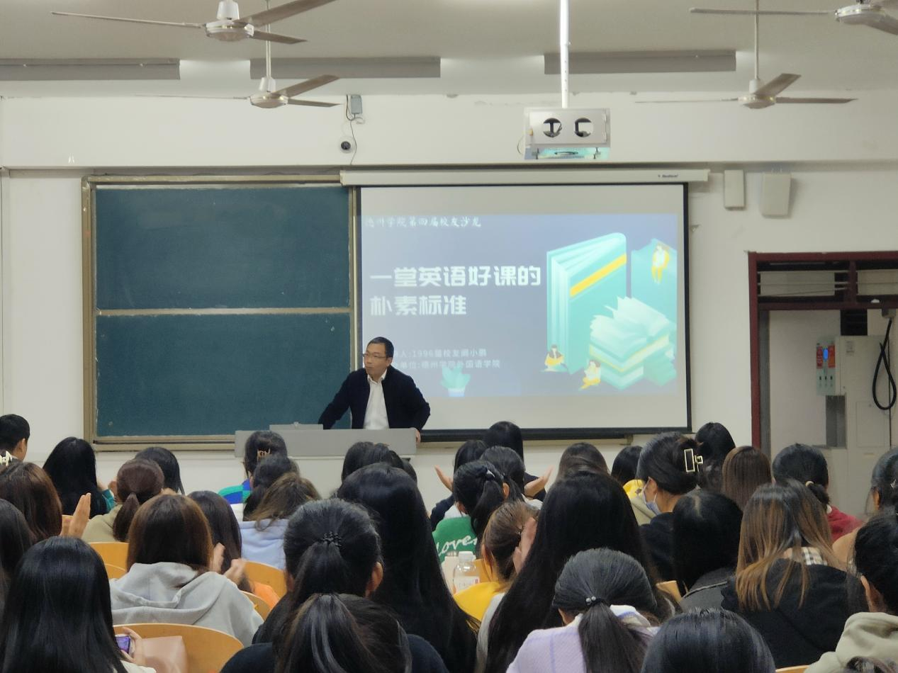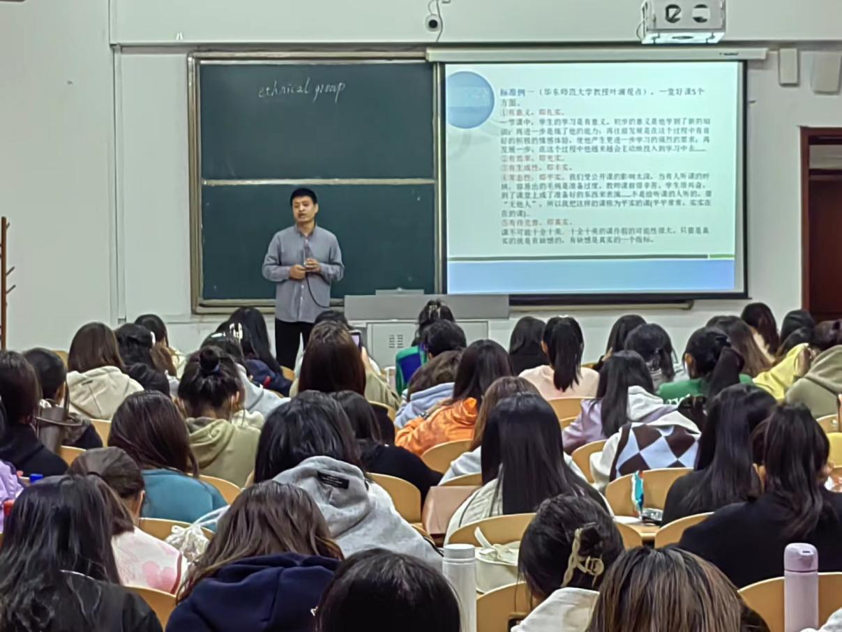 首先,太阳tyc集团5997党委书记张国强对阚小鹏的到来表示热烈欢迎并对其进行简单的介绍。随后,阚老师以《一堂英语好课的朴素标准》为主题向同学做了主题汇报,倾情分享了“‘适合课堂观察的分析性评价,适合大规模考试的印象性评价’的两大概念”、“大众对好课的评价标准”等经验和准备。鼓励同学们多参与教学实习、实践及讲课比赛等活动,提早锻炼自身“独立备课能力、课堂教学组织能力、教学科研能力、教育创新能力等”。