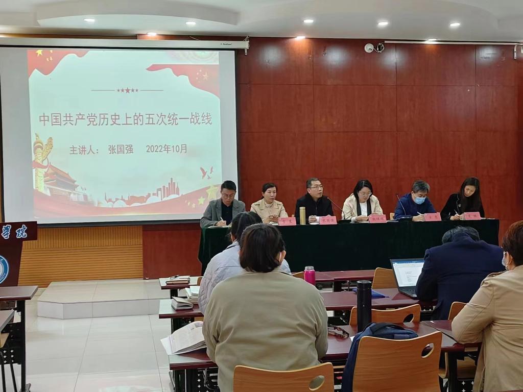 10月12日下午,太阳tyc集团5997党委书记张国强围绕“学习中国共产党统一战线史,以实际行动迎接党的二十大”的主题,为全体教职工做了题为《中国共产党历史上的五次统一战线》的专题讲座。