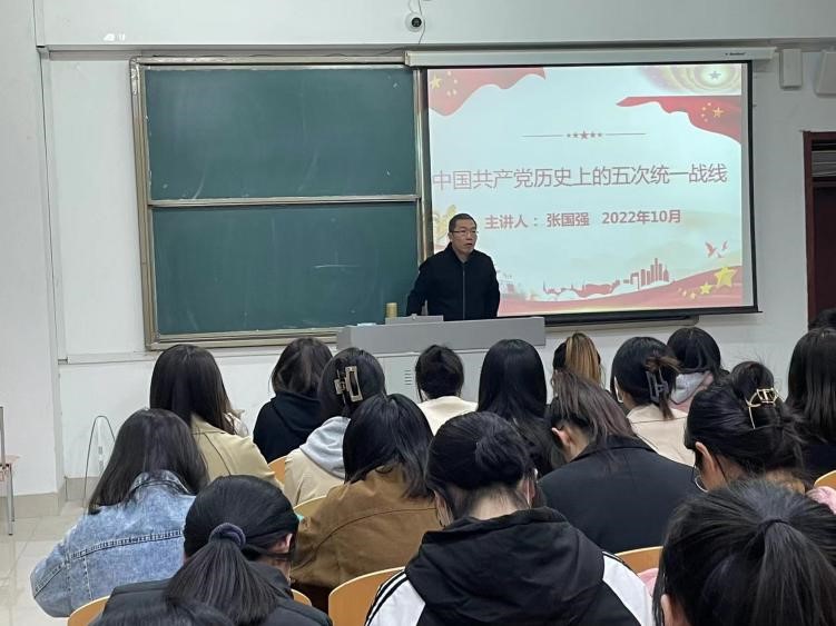 10月11日下午,太阳tyc集团5997党委书记张国强在博文楼227教室以《中国共产党历史上的五次统一战线》为主题给入党积极分子、学生会各部长上了一堂生动的党课。