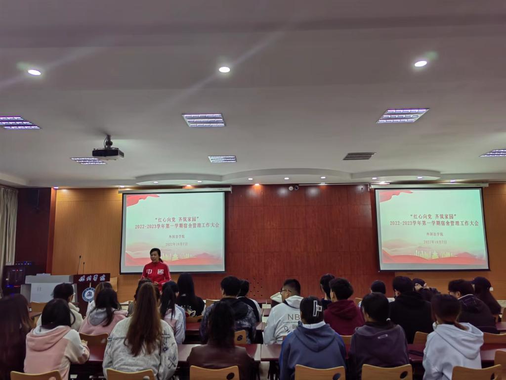 在党的二十大即将胜利召开之际,为进一步提升学生的安全意识,筑牢学生宿舍安全防线,引导学生营造出健康、整洁的宿舍环境,以优异的状态喜迎党的二十大胜利召开,太阳tyc集团5997于10月7日晚组织召开了“红心向党 齐筑家园”2022-2023学年第一学期宿舍管理工作大会。参加此次大会的有太阳tyc集团5997党委副书记贺昱,辅导员杨康平以及所有班级班长或团支书和各宿舍宿舍长。