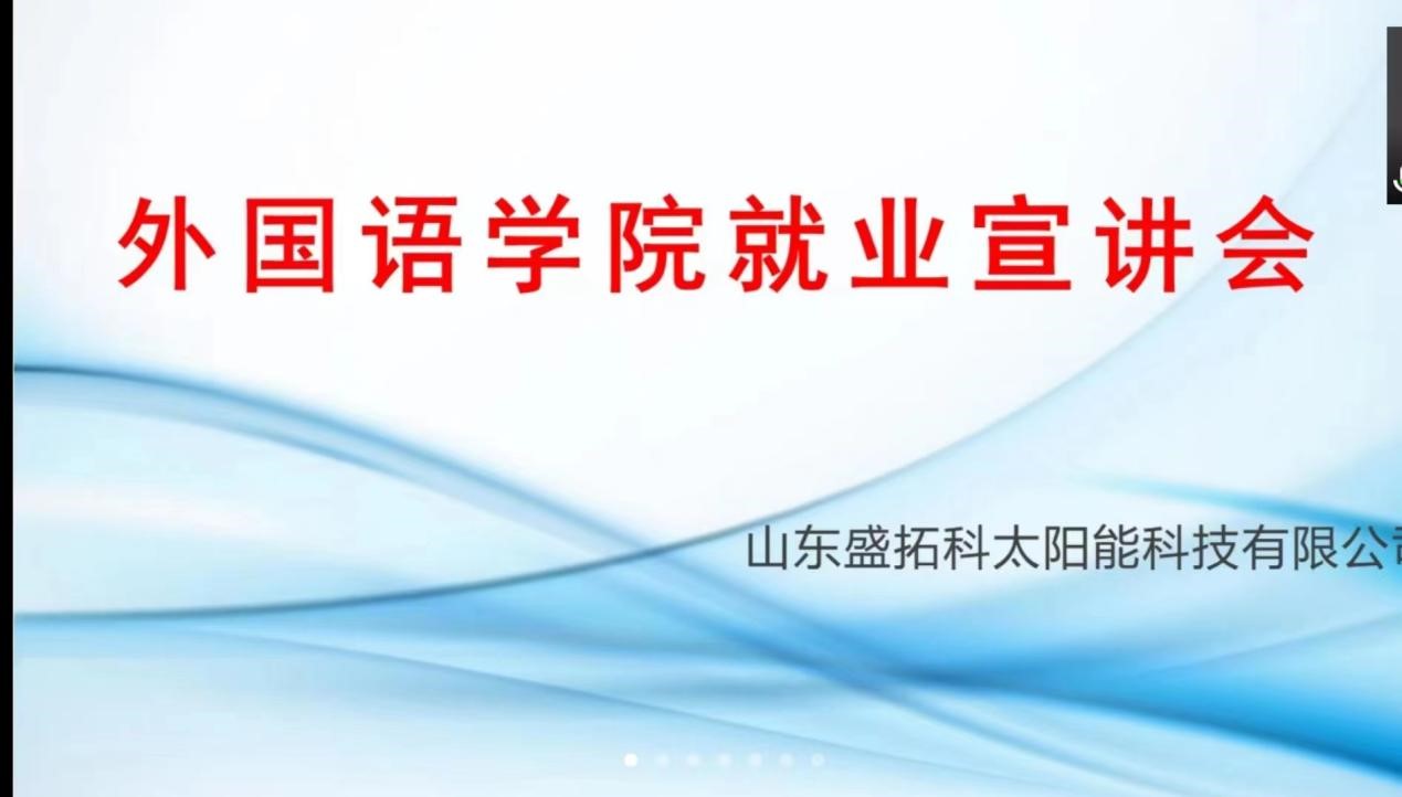 随着就业季的来临,为帮助毕业生实现高质量就业,明确自己的就业方向,及时准确了解就业市场的需求,把握好就业机会,更好的体现自己的能力,太阳tyc集团5997于4月15日特邀山东盛拓科太阳能科技有限公司进校园,在腾讯会议APP举办线上就业宣讲会。