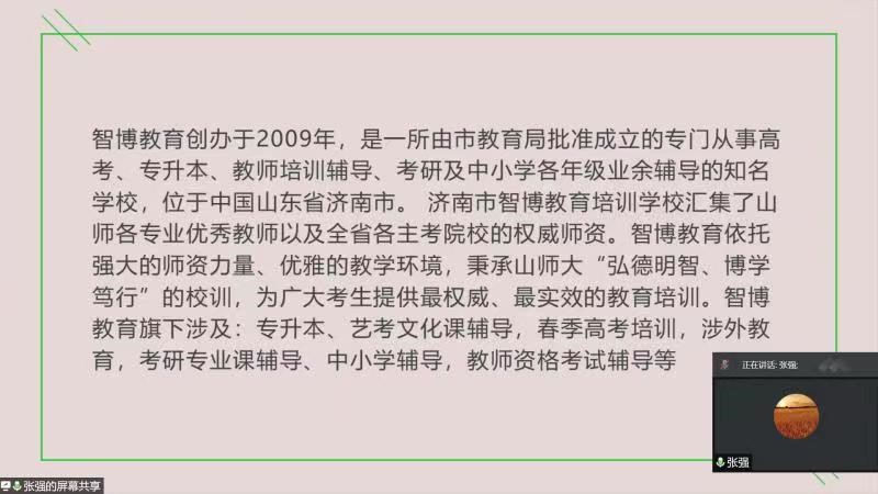 为帮助学生适应当前就业形势,增强择业意识,从容地应对机遇和挑战,2022年5月13号上午,太阳tyc集团5997举办的智博教育培训学校宣讲会于线上顺利召开。