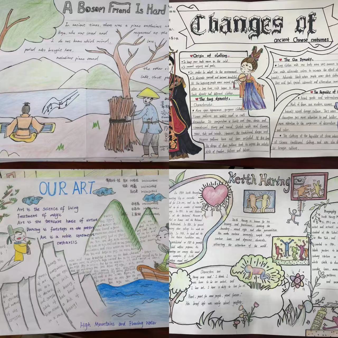 以课程育人效果为旨归。结合单元学习主题,同学们积极搜集资料,展示自己的学习成果。如讲解课文High Mountains and Flowing Water,教师引导音乐专业学生不仅要体会音乐的共情作用,还要懂得无论是网上交友还是传统的交友方式,真正的朋友是始于性情,忠于人品,久于真心。在学习课文Chinese Chi-pao和Art for everyone时,服装专业学生通过画作展示旗袍的发展进化,美术专业学生通过京剧脸谱推介中国国粹。总之,学生利用自己的专业特长将所学英语知识展现出来,增强了学习英语的信心,增加了文化自信。同时,教师的引导还帮助学生体会到了中西艺术形式的不同,并且明白无论中西,只有大众的、人民的艺术才能传承,才有生命力。