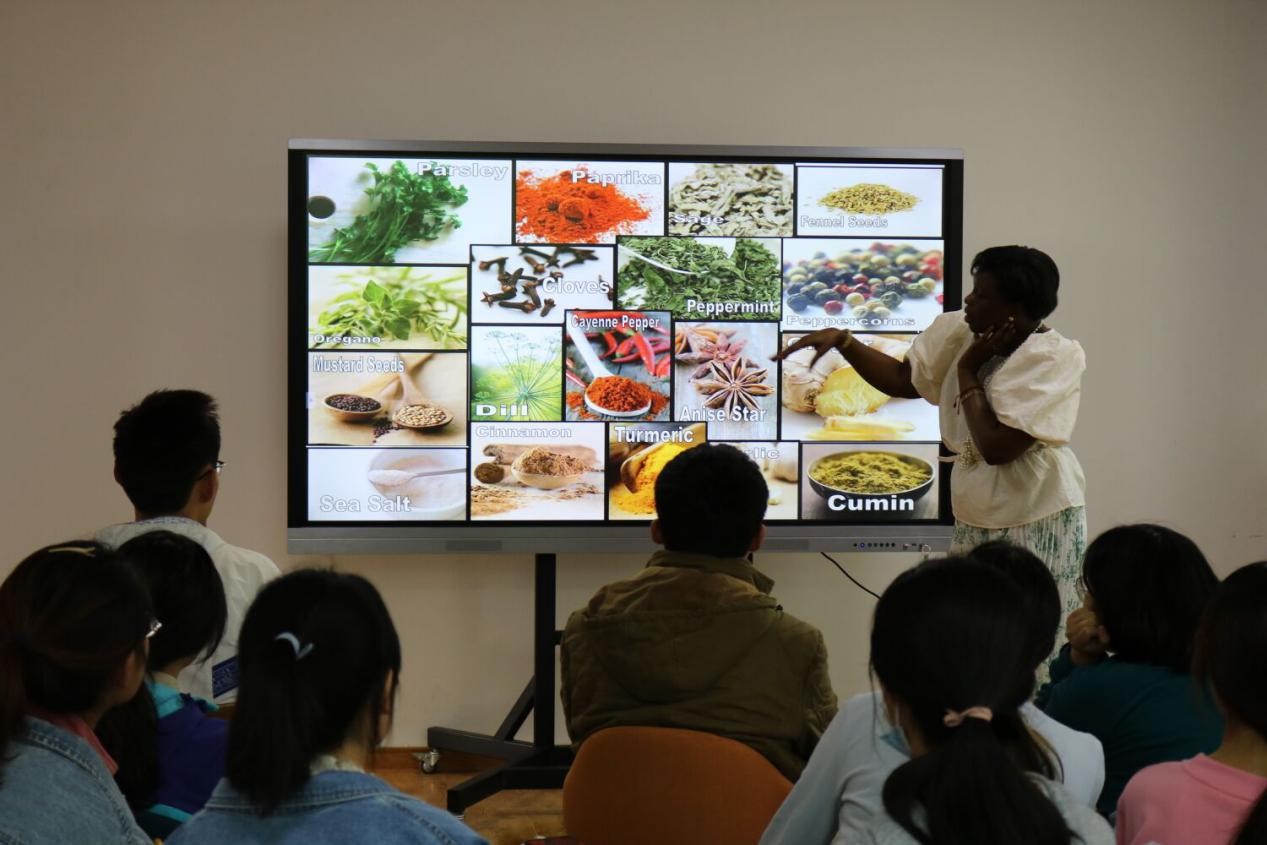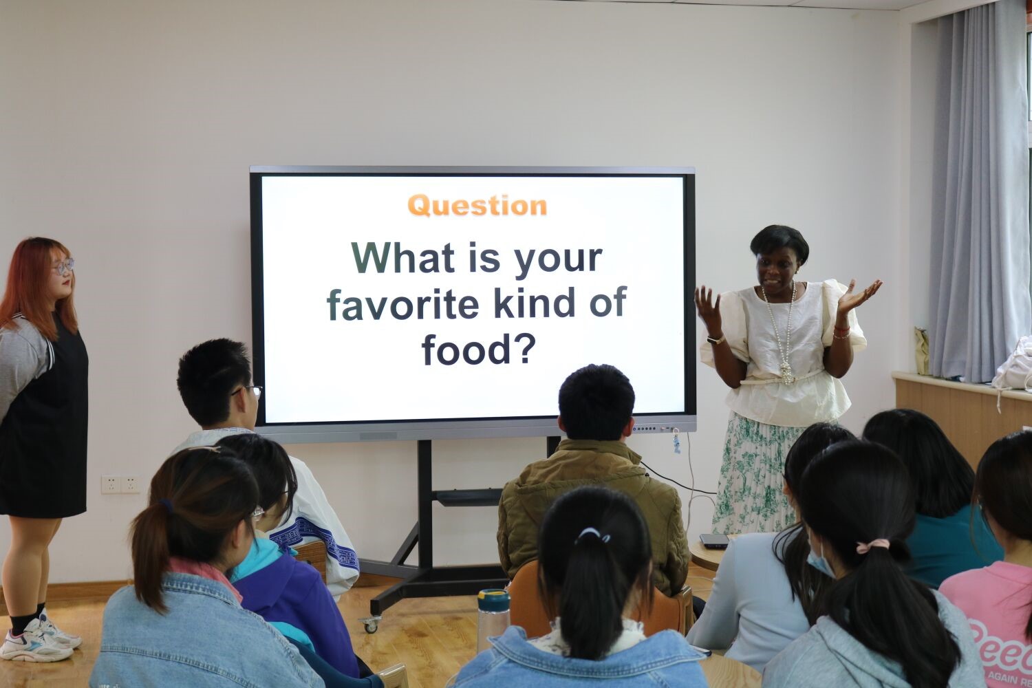 Dahlia老师通过Guessing game、观看视频等环节,使同学们对世界各地的美食种类有了更加全面的理解。老师为这场沙龙活动做了丰富的准备:首先,每位同学在走进教室时,根据地表指引浏览墙上来自世界各地的美食图片,再根据这些图片写下一个从”food”想到的词语,随后就坐。活动期间,伴随着PPT的讲解,老师为同学们准备了许多图片和视频,期间穿插着老师和同学们精彩的讨论。在整个活动过程中,老师非常有耐心,为了让每个人都能放松,都能参与到活动中来,老师先同各位同学进行了简单的会话,鼓励大家大胆地表达自己的想法,同学们也都报以积极的回应。整个活动过程都非常精彩,非常有趣。同学们在收获快乐的同时还学到了知识,也进一步提高了自己的英语表达能力。