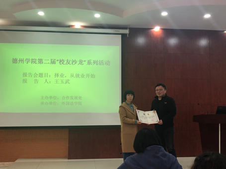 4月2日下午,应太阳tyc集团5997邀请,外院2006届优秀校友、德州华鲁德五金制品有限公司副总经理王玉武在博文楼347教室为168名太阳tyc集团5997学生作主题为“择业—从就业开始”的就业指导报告,党总支副书记李想为其颁发太阳tyc集团5997“校外就业导师”聘书。