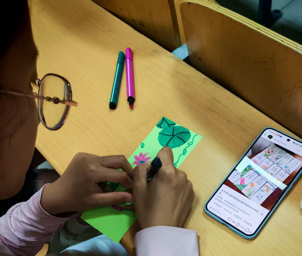 活动现场,同学们围绕“感恩奋进”“筑梦未来”等主题,通过手绘、拼贴、篆刻等形式,在书签中融入励志格言、经典名句、自然风景等多种元素,将励志与梦想赋予到书签之上。每一件作品都体现着同学们的创意与温度。在书签作品展示交流环节,同学们纷纷展示自己的作品,互相交流创作感受,并分享自己的未来梦想和规划。所制作的部分书签后续将赠予师生,持续传递这份温暖。