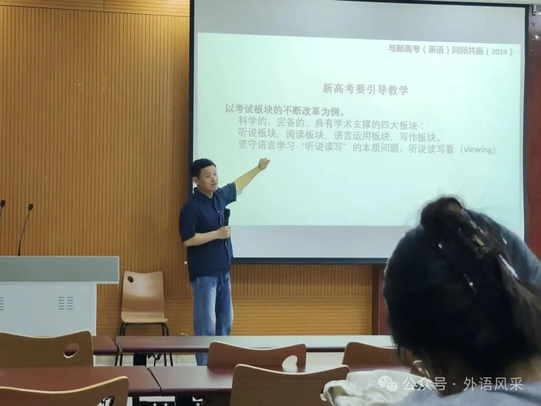 讲座伊始,阚小鹏主任聚焦新高考改革,系统梳理了近年来高考英语在命题趋势、考核重点、题型结构等方面的变革思路。通过详实的数据与典型案例分析,为同学们明晰了未来从事初高中英语教学的方向与着力点,帮助大家提前锚定教学目标与策略。