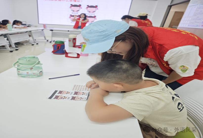 活动前期,志愿者团队结合儿童认知特点准备了情绪主题单词卡、奖励贴纸等教学物料;活动正式开始后,志愿者以情绪主题英语动画片开场,借助片中卡通角色的表情与台词引导孩子们初步认知 “happy(开心)”“sad(难过)”“angry(生气)” 等基础情绪词汇、建立英语学习兴趣,进入单词教学环节后,志愿者使用印有表情插画与对应英语单词的 “情绪主题单词卡”,通过“绘画+英语”联动教学法,先示范绘画“smile(微笑)”“cry(哭泣)”“laugh(大笑)”等表情并同步朗读单词,再邀请孩子们参与绘画并结合画作讲解词汇含义以帮助理解单词与情绪的关联,随后开展的“表情猜猜猜”互动游戏中,孩子们以小组为单位根据志愿者出示的表情简笔画竞猜对应英语词汇,准确回答或积极参与的孩子可获贴纸奖励,进一步巩固所学内容。