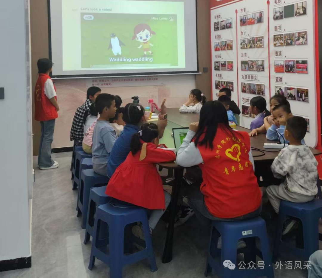志愿者们化身“趣味英语导师”,以多元形式开展教学——手持色彩明丽的动物卡片,搭配灵动的肢体语言,为孩子们讲解“dog”“cat”“panda”等动物词汇。