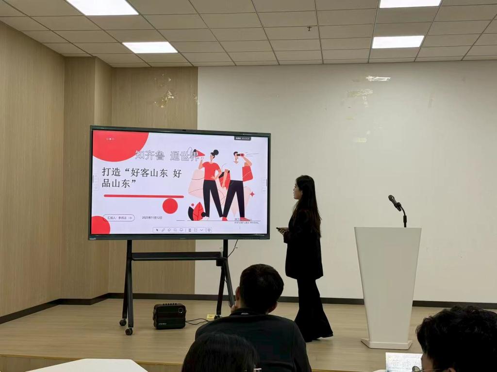 本次院赛答辩会共5支团队参与。各团队围绕项目的社会价值、创新亮点、实践历程及发展前景,以清晰的逻辑、扎实的专业功底和饱满的热情进行阐释。“校园E动:智跃云阶——校园里的AI健身体验魔方”项目,将人工智能与校园健身结合,契合高校体育育人理念;“知齐鲁,通世界”团队,聚焦齐鲁文化国际传播,构建跨语种文化术语图谱,为山东品牌注入传播活力;“地面LED标志标线电子交通智慧停车位”项目,致力于解决城市停车难题;“桑‘链’启航——AI全链路赋能古桑特产文化助农振兴计划”项目,将人工智能与德州古桑特色资源结合,探索科技赋能农业与乡村振兴新途径。