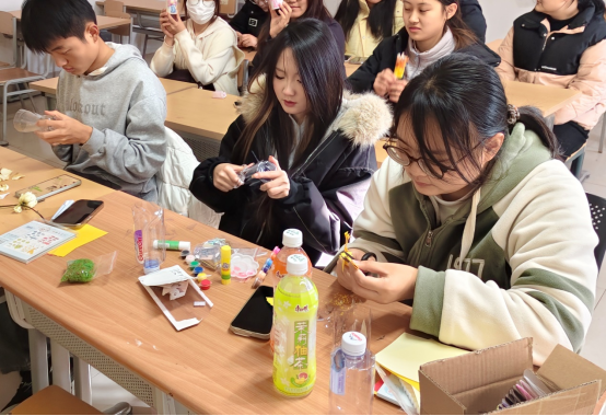 主持人首先向同学们阐释了本次手工作品“火花”作为希望与光明象征的寓意,希望同学们即使在寒冬之际内心也要保持温暖与希望。参与者使用提前收集的枫叶、松果、干花等植物素材,结合塑料瓶、画布等材料进行自由创作。创作过程中,同学们充分发挥想象力与创造力,或独自构思,将枫叶拼贴成灵动的“火花”造型;或相互协作,用各色花朵点缀作品边缘,一片片普通的植物素材被赋予了新的生机与意义。