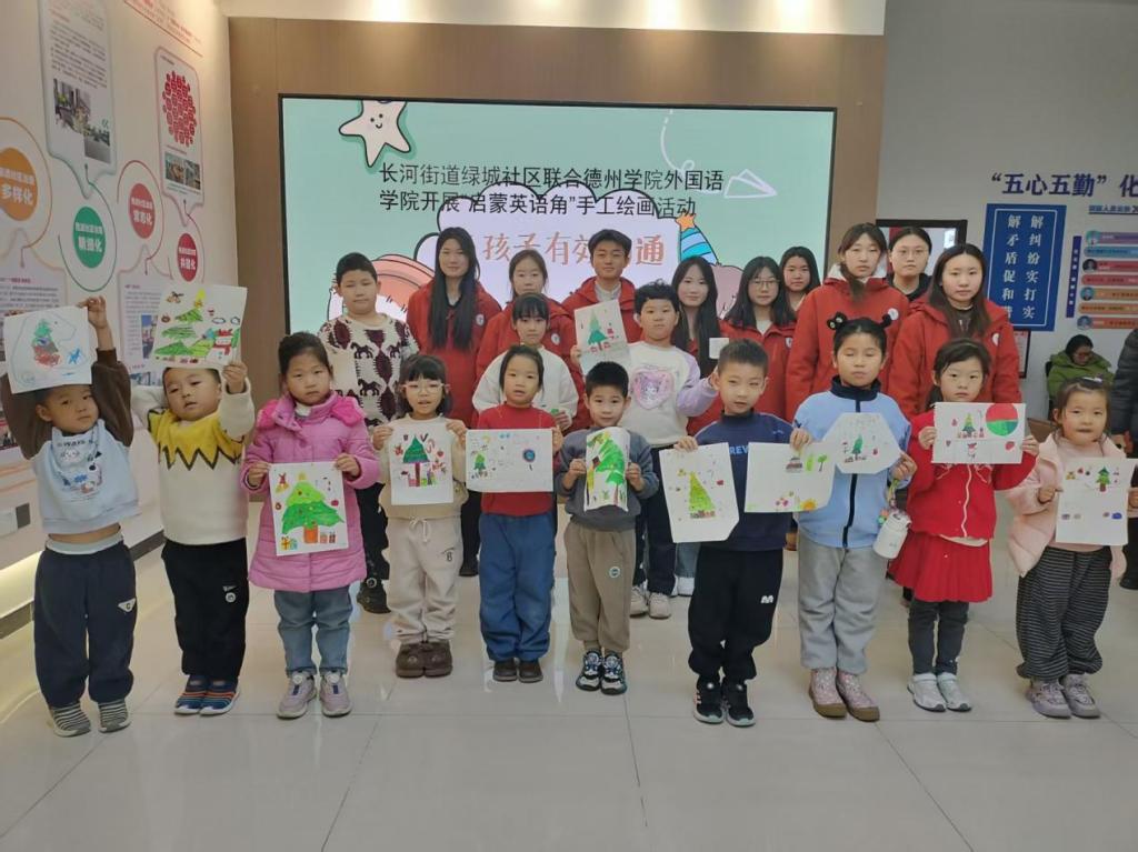 12月7日,2024级商务英语二班团支部走进肖何庄社区,带来“大雪启韵,英述中华”主题志愿服务教学活动。志愿者们先以通俗的语言介绍大雪节气的起源与物候特征,通过趣味问答唤起孩子们对冬日雪景的美好遐想;随后以双语讲解为特色,带领孩子们探寻腌肉、补冬等传统习俗的文化内涵,一同品读《江雪》等经典节气古诗,并巧用简单英语解析诗句中的雪景意象,让中华传统文化与外语学习深度融合。在“画说英语”环节,孩子们发挥想象力,手绘雪人、雪景等冬日主题作品,完成后逐一登台展示创作思路与感受。志愿者们还为每位孩子送上精心制作的大雪主题盘子画作为纪念,整场活动在温馨的合影中圆满落幕,既传播了节气文化,又锻炼了孩子们的表达能力。