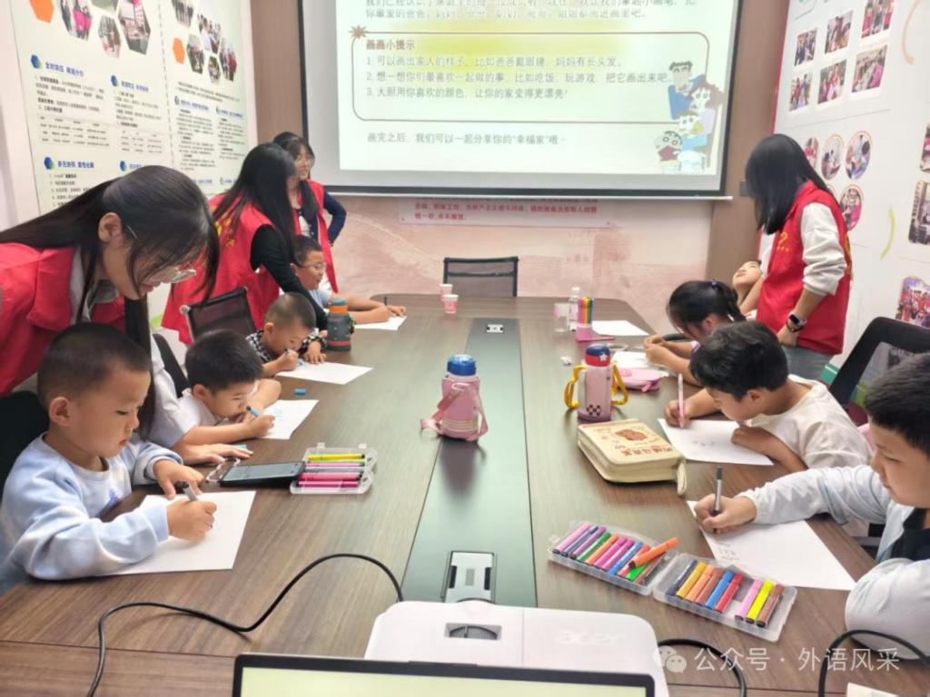 志愿者以“学用结合”为核心设计教学内容,让英语学习走出课本。在基础教学环节,志愿者结合生活场景讲解“家庭”主题词汇,通过卡片配对、发音模仿等小游戏,帮助孩子们快速掌握“father”“mother”等基础表达,降低语言学习的陌生感。绘画创作与英语表达融合环节成为活动亮点。志愿者引导孩子们拿起画笔,勾勒家庭成员形象,随后鼓励大家用英语介绍自己的画作,如“This is my sister. She likes red.”。这种“画说英语”的形式,既保护了孩子们的创作热情,又让他们在轻松的氛围中突破表达障碍,实现了“动手”与“开口”的双重提升。