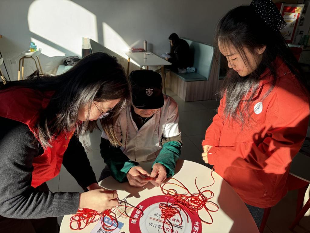 为传承中华优秀传统文化,丰富校内老年工作者的精神文化生活,12月6日,太阳tyc集团5997志愿者们走进馨苑餐厅,与校内餐厅工作人员共同开展“绳结非遗,情暖银龄”中国结制作教学志愿服务活动,让非遗文化在指尖流转、温暖传递。