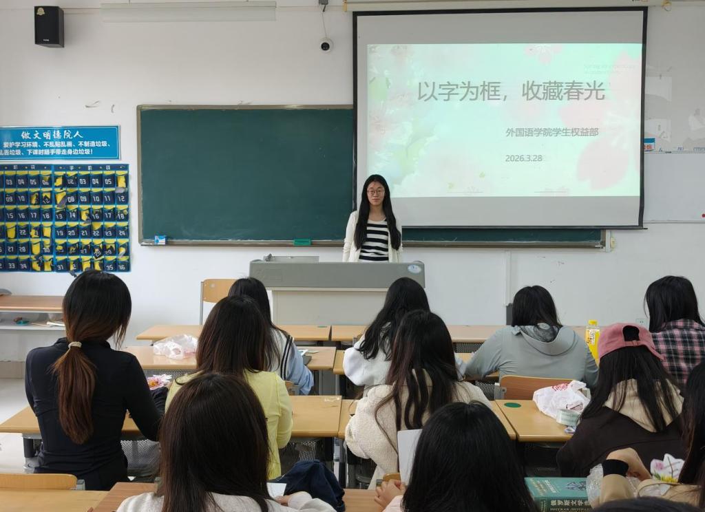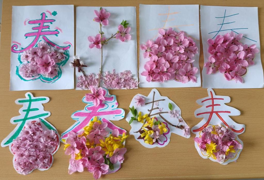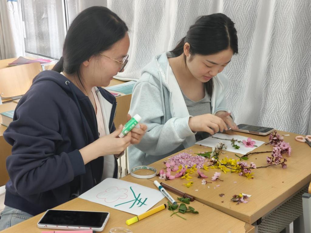 创作环节中,同学们将采集的花叶巧妙嵌入汉字笔画之中。有的用层层樱花填满“春”字,寓意生机盎然;有的以嫩叶勾勒“暖”字轮廓,传递温情脉脉;还有同学将多种花材混搭,让汉字成为一幅立体的春日画卷。活动现场花香浮动,同学们或专注粘贴,或互相交流创意,在动手实践中逐渐放松身心。