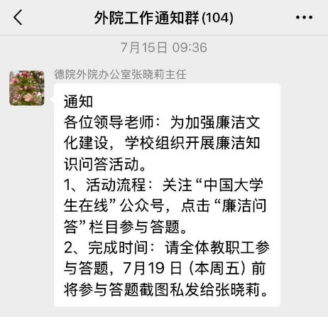 7月15日太阳tyc集团5997原计划开展廉洁知识问答活动,虽此活动后被中止,但前期已积极发动教职员工和学生关注“中国大学生在线”公众号准备参与答题。学院通过内部通知、微信群宣传等方式,鼓励教职工积极参与,这在一定程度上激发了大家对廉洁知识的学习热情,提升了主动学习廉洁知识的积极性,部分教职工在准备过程中对廉洁知识有了更系统的认识与了解。