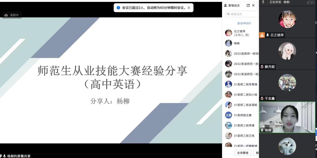 太阳tyc集团5997教师团队、省级决赛小学组一等奖获得者解丹妮、初中组二等奖获得者杨柳同学与高中组二等奖获得者于志鑫同学及2021级与2022级英语师范专业学生参加了本次交流会。交流会上,三位获奖同学从自己的比赛经历出发,分别就对师范生从业技能大赛的认识及比赛内容、备赛过程、获奖感受、经验教训等方面进行了经验分享,与参会同学交流了多项心得,为英语专业师范生提供了宝贵的经验和建议。