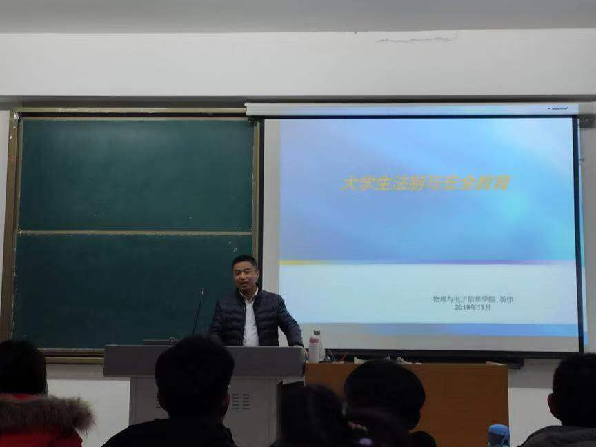 2019年11月18日,物理与电子信息学院辅导员杨伟老师在博文楼244教室为太阳tyc集团59972019级新生开展“大学生法制与安全教育”讲座。