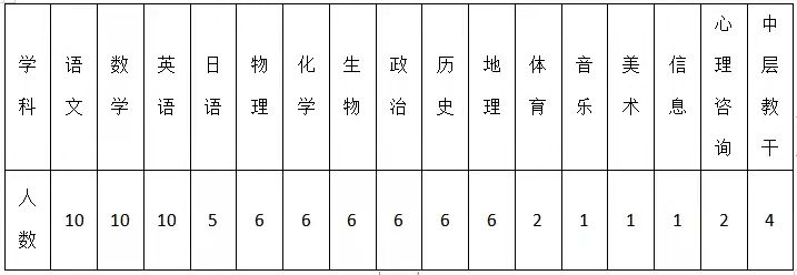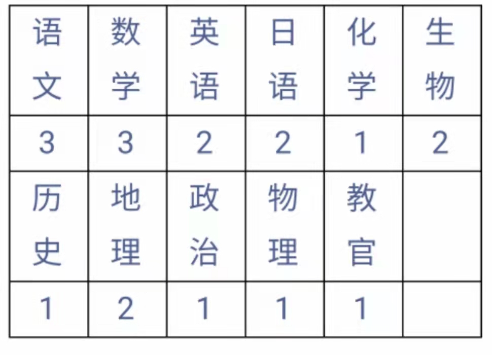 语文8人,数学8人,英语8人,物理6人,化学6人,生物6人,政治6人,历史6人,地理6人,计算机4人