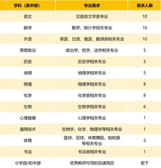 3.应聘融合部(原高中国际部)的英语教师,需取得英语专业八级证书或雅思 7.0 分以上或托福 100 分以上,具有海外学习经历或 A-level 课程教学经验者优先。