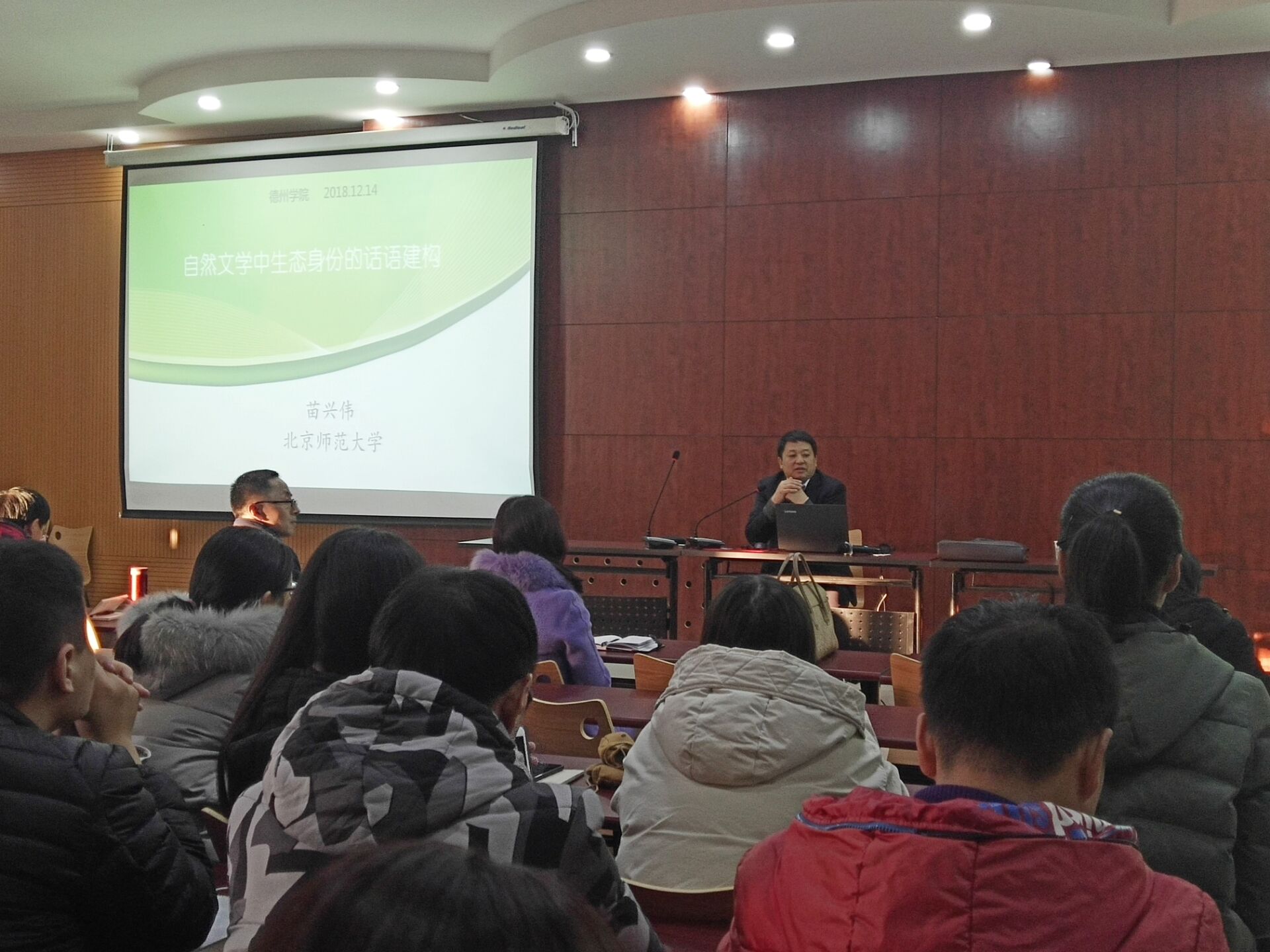 2018年12月14日下午,北京师范大学外国语言文学学院院长苗兴伟教授应邀来我院举办讲座。苗教授以“自然文学中生态身份的话语建构”和“生态文明的话语实践”为题,为我院2018级师生带来了一场精彩的学术报告。